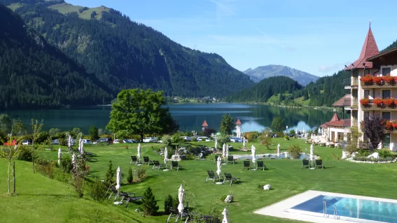 Der Haldensee zum Greifen nahe, im Sommer umgeben von blühenden Wiesen, die im Winter mit weißer Pracht zu Schnee- und Wintervergnügen einladen. Und erst der Haldensee! Fest zugefroren und mit flauschigen Schneeflocken bedeckt, lädt er die Gäste des Hotels Laternd’l Hofs zu einer Langlauftour auf der gespurten Loipe oder zu einem Fußmarsch ein.